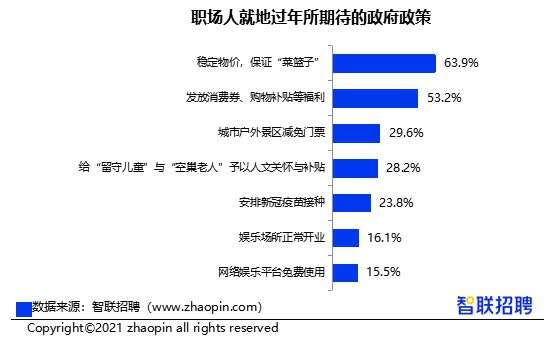 “就地过年”的职场群体对当地政策有相应的期待,63.9%的受访者呼吁政府在春节期间“稳定物价,保证‘菜篮子’”,53.2%的受访者期待政府“发放消费券、购物补贴等福利,29.6%的受访者期待“城市户外景区减免门票”以丰富精神文化生活。28.2%的受访者还希望各地政府能给予留守儿童、空巢老人更多人文关怀与补贴,其中家在县城和农村的受访者选择该选项的占比更高。