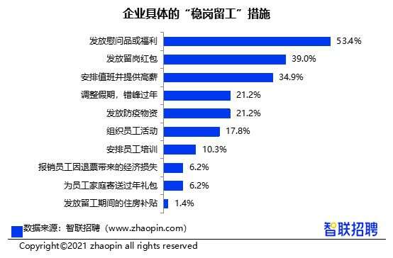 从措施的具体实施手段来看,企业普遍采纳以“钱”留人的实惠方式,其中“发放慰问品或福利”占比最高,达53.4%,其次是“发放留岗红包(39%)”和“安排值班并提供高薪(34.9%)”。