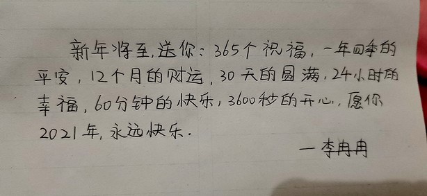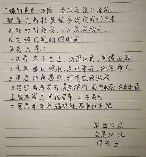 所求皆如愿,所行化坦途。李冉冉同学的新年里运用了很多数字,这些数字每个都很圆满,充斥着祝福的气息。周艺苗同学书写了她的六个愿望,对自己,对他人,对家庭,对自然,对万物皆有所愿。
