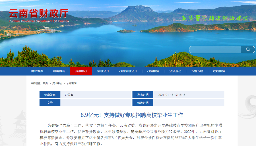 据云南财政厅官方网站1月18日消息,云南省财政厅积极筹措资金,专项安排并下达全省各州市8.9亿元资金,对符合条件招录在岗的36774名大学生给予一次性就业补贴,有力支持做好专项招聘工作。