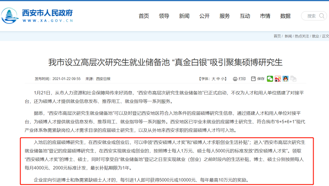 1月21日,西安市人力资源和社会保障局宣布,“西安市高层次研究生就业储备池”已正式启动。