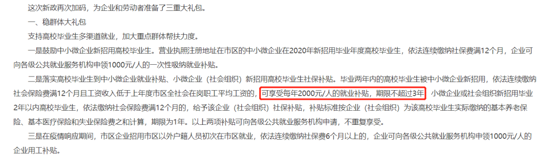 此前,杭州市人力社保局联合市财政局、市商务局、市民政局、市农业农村局等部门出台了《关于进一步做好稳就业保就业工作的通知》。通知称,毕业两年内的高校毕业生被中小微企业新招用,可享受每年2000元/人的就业补贴。政策从2021年1月31日起执行。