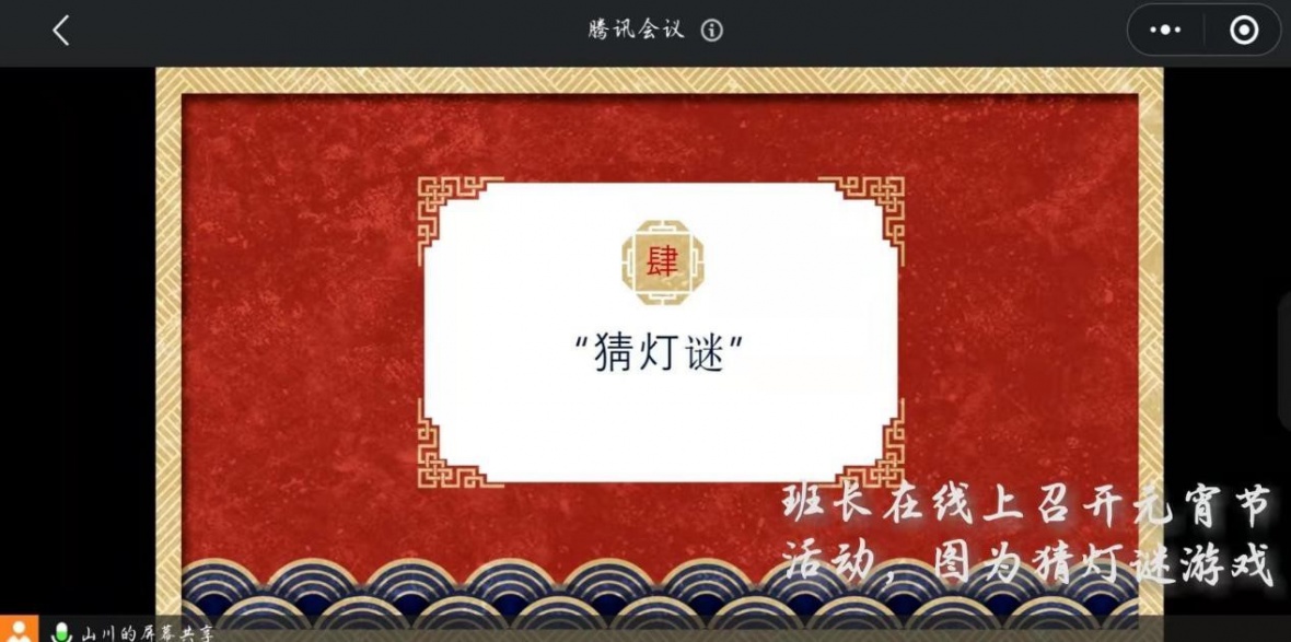 为了充分调动同学们的积极性,紧接着就开展了富有民族风格的传统民族文娱活动——猜灯谜,直播中热火朝天的实时弹幕更是可见活动的火热程度。在此次“闹元宵”活动中,最受欢迎的当属“神秘大礼包”环节,以抢答的方式,为每轮首位答对的同学送上由班委精心准备的元宵礼品。此外,采取线下统计的方式,为参与此次活动积极活跃的同学送上惊喜礼品。