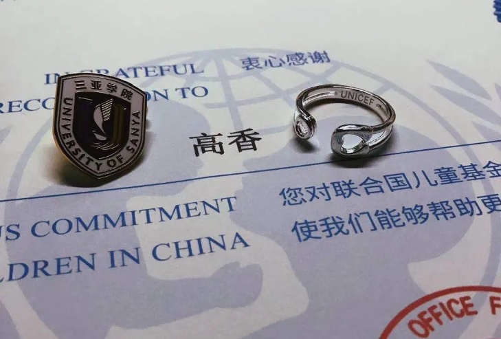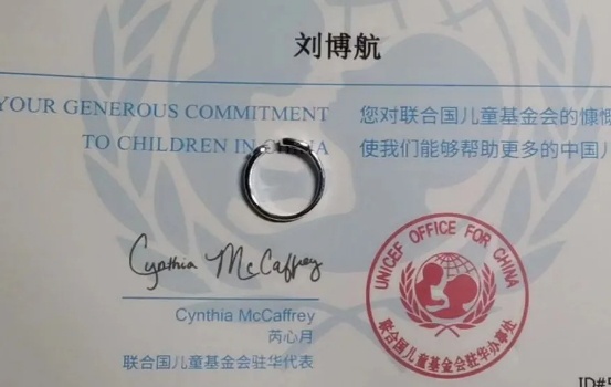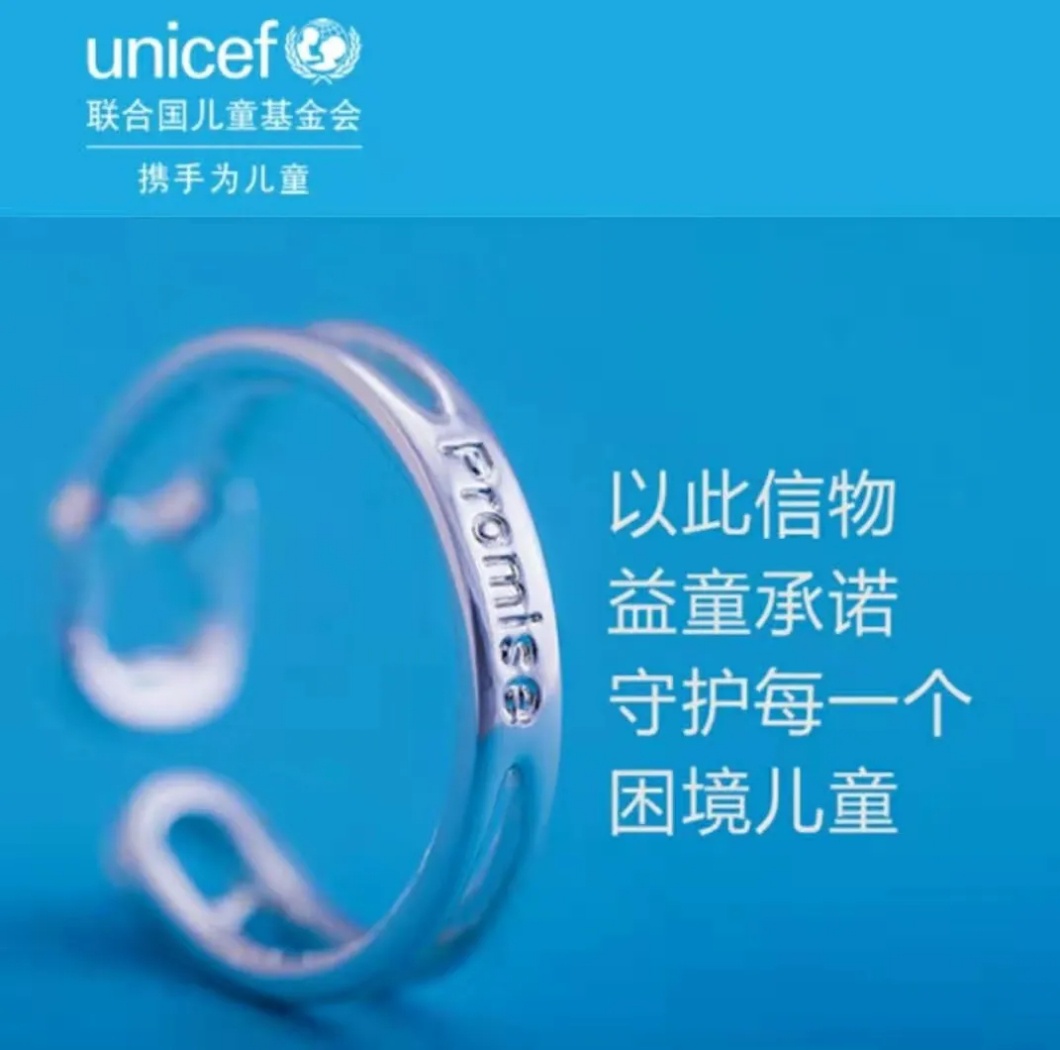 这枚戒指是一个来自UNICEF的纪念礼物,此外还有一封感谢信。这枚戒指的设计非常有心,由两颗心组成的别针形状,戒圈外侧刻着“Promise”以此信物,承诺守护每一个困境儿童。预计会在第一个扣款日的30个工作日内,就可以收到由联合国儿童基金会寄来的证书以及戒指信物。