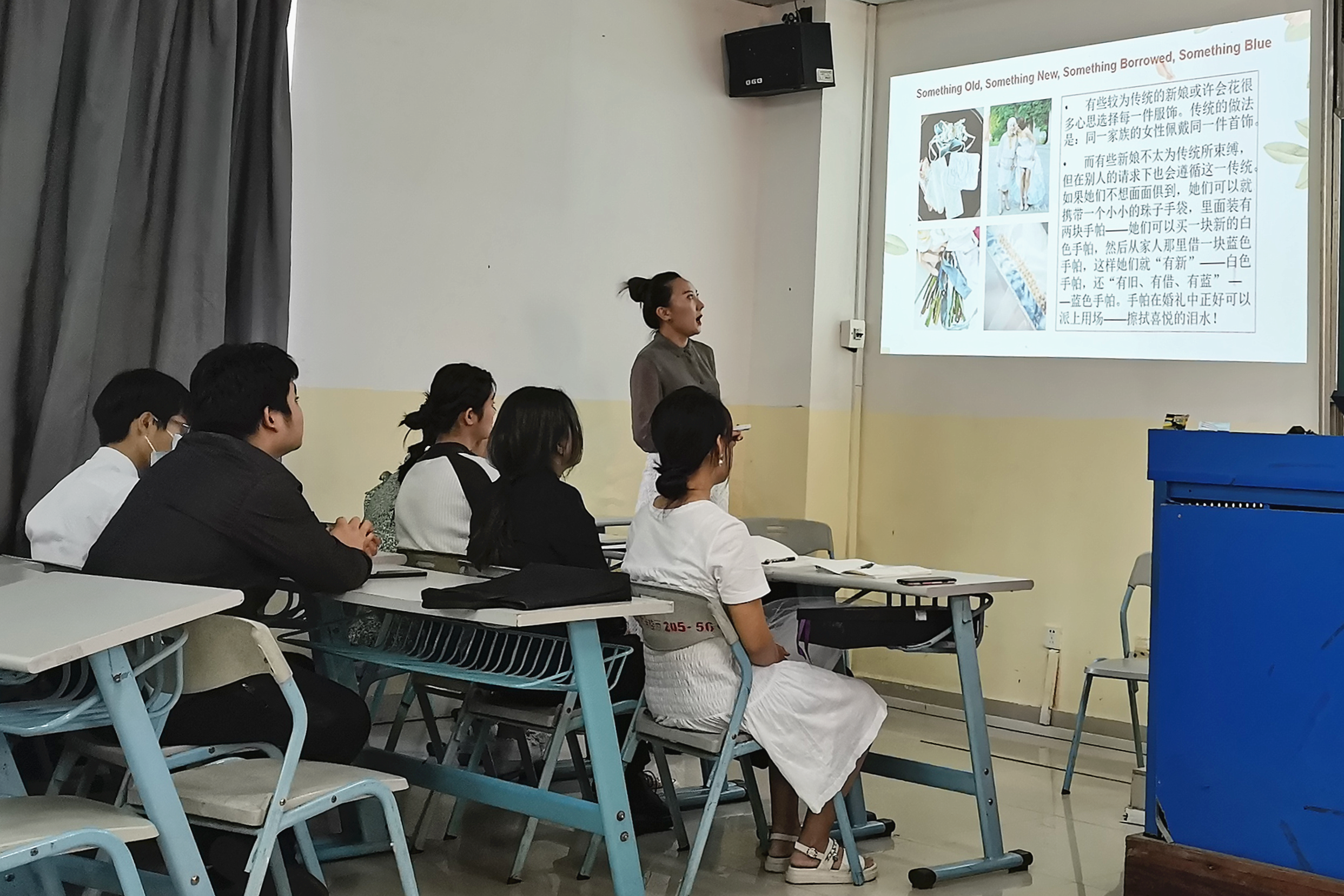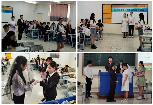 每个小组各有特色与创新,有的小组采用了教堂婚礼的形式,扮演“神父”的学生用英文主持仪式,还有的小组是以证婚人主持西式婚礼的形式,甚至有的小组事先做好了快闪视频和照片PPT配合婚礼氛围。而无论是哪种形式,各环节都需要注重细节的把握。在每一组小组表演完成后,其余各小组现场打分,最终评选出一组完整度最完善、流畅度最高,礼仪运用最合理的小组。在张南老师现场点评总结后,给获得最高分的第八组颁发了奖品。