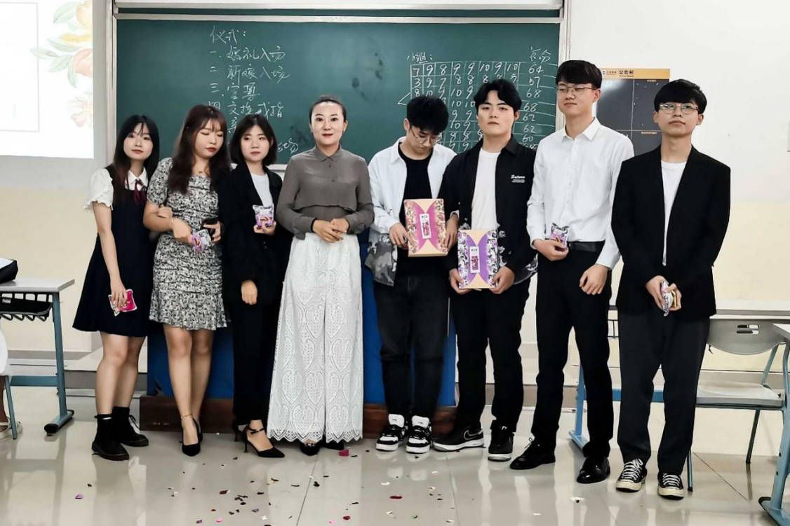 课程伊始,隐约听到了优美的音乐声从书知楼2108教室传出。推开教室的门,装扮、背台词、准备PPT,会展1801班的学生们正在为即将要开始进行的婚礼礼仪与宴会设计课程做课前的小组彩排练习。