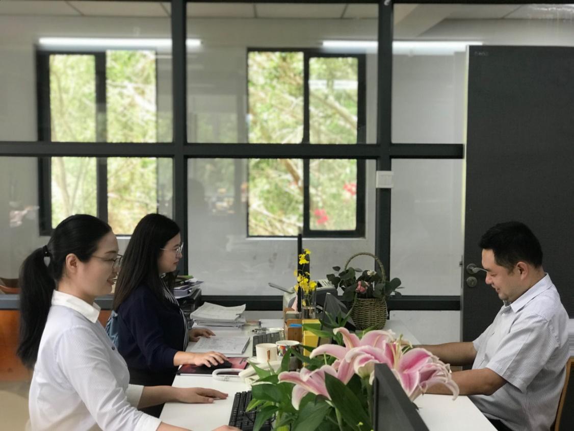 在旅酒学院办公区里,成熟稳重的气质在每一位教师的身上体现得淋漓尽致。走廊上有穿着院服前来办事的学生、办公室里教师们穿着正装在安静的备课、行政综合办公室里教师们微笑着耐心地为学业咨询的同学答疑解惑,一切都显得井然有序。职业化的身影从明亮的玻璃窗中透出来,折射出一道道靓丽而独特的风景线。