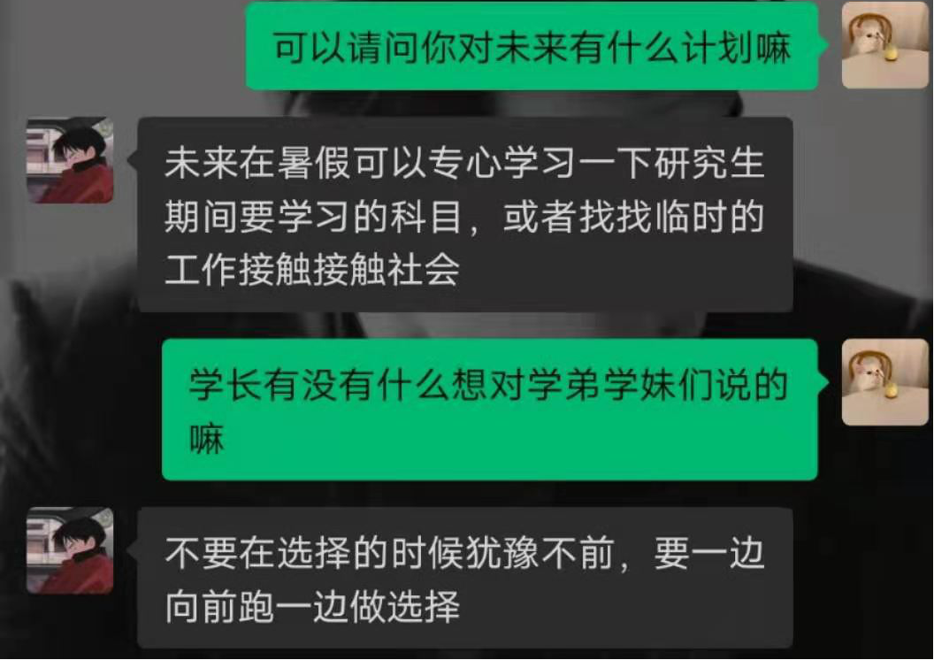 挑战人生是无悔的选择,决胜考验是不懈的追求,刘常旭还计划未来在暑假可以专心学习一下研究生期间要学习的科目,或者找一份工作来接触下社会,并建议学生们细节决定成败,态度决定一切,只要有心,以积极态度去思考,努力的过程中所获得的一切都是成长,不要在选择的时候犹豫不前,要一边向前跑一边做选择。