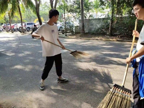 我班学生在班长、团支书等班委的带领下积极地拿着劳动工具进行地面清扫。部分学生全程手握扫帚,认真地清扫地面,地上的垃圾、树叶都被扫得一干二净,没有打扫工具的学生紧跟着其他有扫帚的学生,及时将垃圾收入垃圾袋中,没有丝毫的懈怠。通过本次劳动课程,我班学生既感受到了劳动的辛苦,也看到了劳动的成果,地面干净得让人一看就觉得十分舒爽。
