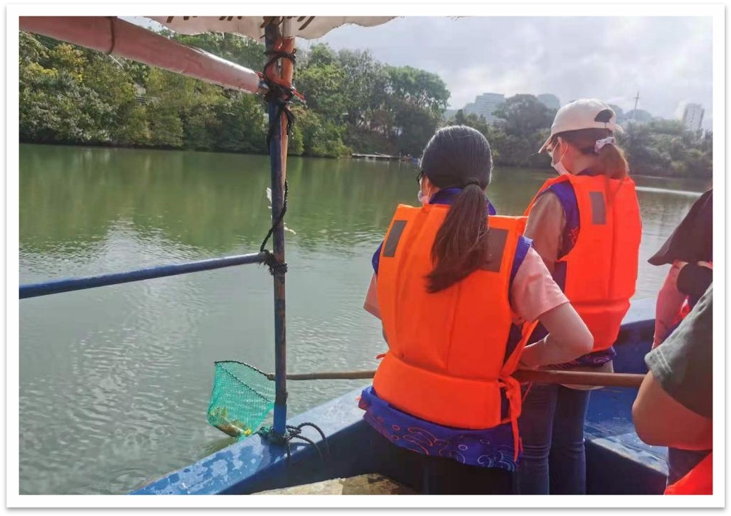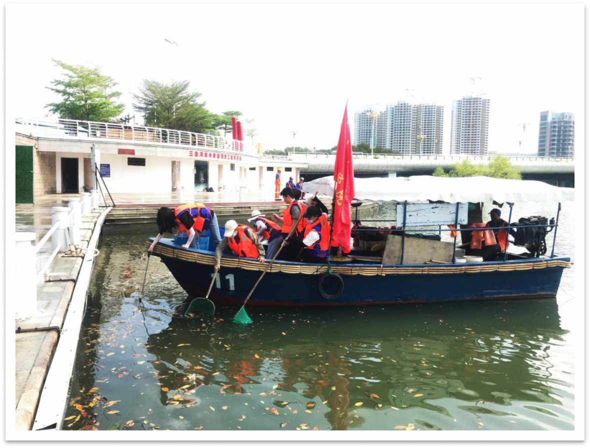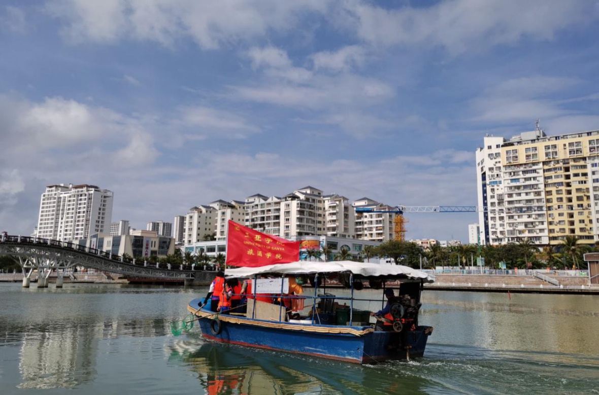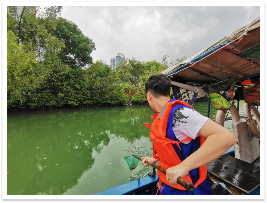 据现场了解,志愿者同学们穿着整齐的志愿服装,手中拿着船上的捞网工具,大家纷纷投入到三亚母亲河的行动中。大家积极地用捞网捞出河面上的纸屑、树叶、木枝,还有的同学也捞起了一些啤酒瓶和矿泉水瓶子。大家热情饱满,干劲十足。虽然在刚开始时,天公不作美,下起了阵雨,但好在很快雨过天晴,丝毫没有影响大家的热情,依旧激情高昂地打捞。雨过天晴后的三亚母亲河上,漂浮着我们两三叶志愿打捞小船,形成了美丽三亚一道亮丽的风景线。