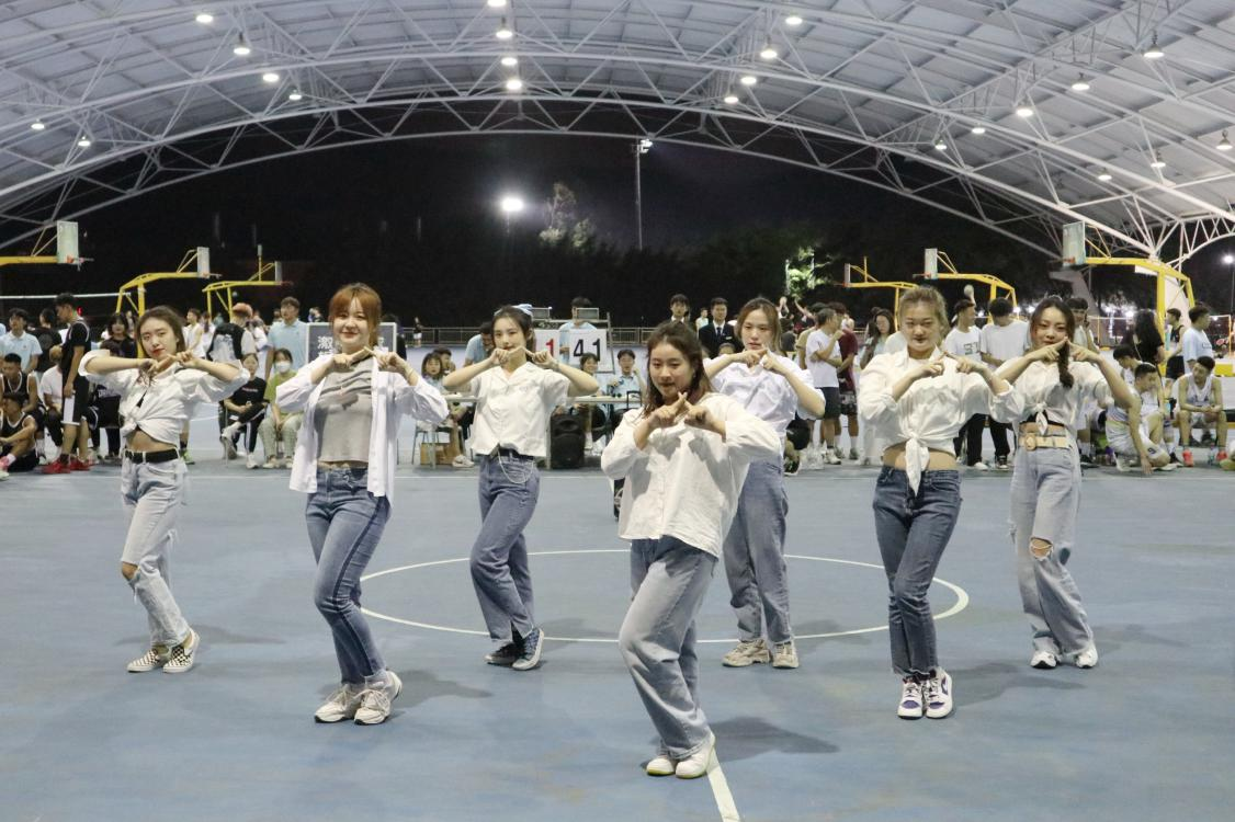 上半场结束中途休息期间旅酒学院文艺部和舞动天涯为学生们带来了精彩的表演,青春靓丽的女学生穿着白衬衣,干净大方,舞蹈动作活力四射,舞蹈活跃了现场气氛,把节奏推向高潮。