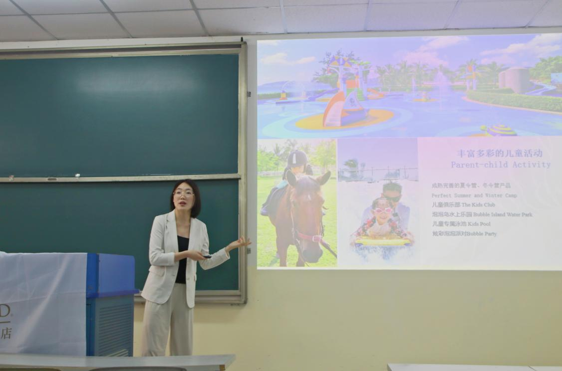 美高梅度假酒店位于三亚亚龙湾,拥有676间客房和13间餐饮场所,其中酒店拥有三大特色:儿童活动亲子游、首创宠物狗度假游、娱乐与夜生活。该酒店与各大品牌都有联名合作,组织过博鳌论坛年会的会务活动和各类公益活动。宣讲过程中,孙经理用有趣的魔术表演积极与学生们互动,让学生可以更好地感受美高梅度假酒店的年轻化。同时她还提到了此次招聘会美高梅酒店主要对前厅部、财务部、人力资源部和餐饮部进行人员招聘。