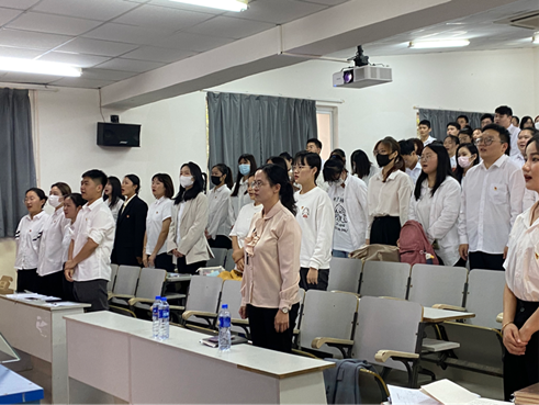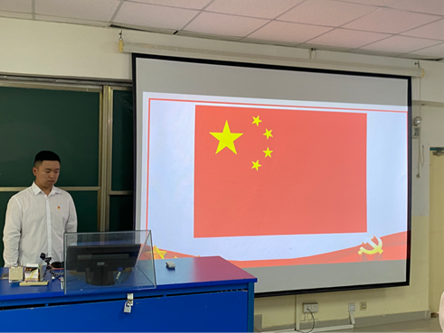 本次会议分为三项议程进行,大会正式开始之前先播放了一个展示我院党员在日常生活中是发光发热的视频,我院学生聚精会神的观看。接着会议的第一项议程全体同志起立,奏唱国歌,用雄壮有力的歌声表达对祖国的热爱之情。
