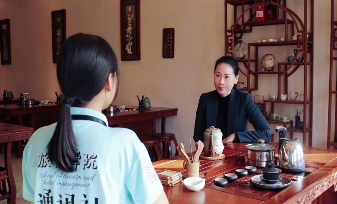 访谈伊始,王婕霏老师对茶艺文化进行了简单介绍。随后,她强调开设茶艺社团不仅是为了传授茶文化知识,更是为了培养学生的人文素养,传播中国茶道文化。同时为了与现代服务业相结合,增强学生就业竞争力,王婕霏老师还与学生共同开设“全域旅游视角下海南茶文化旅游产业链创新研究”项目,并参加省级大学生创新创业训练计划项目。