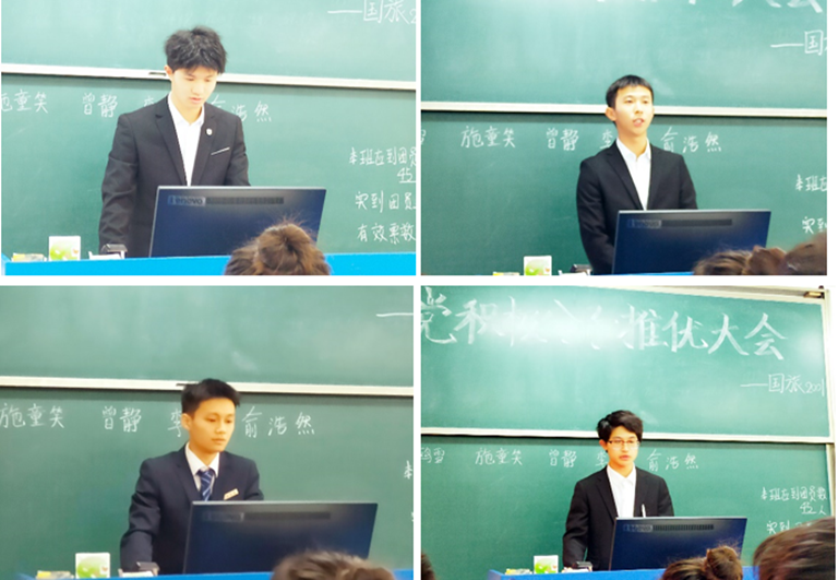 国旅2001班施童笑同学将自己在旅业管理学院学生会体育部的经历分享给同学们,表示很荣幸能够继续作为体育委员为本班同学服务;李阳同学详细讲述了自己从大一担任旅游2001班的班委到如今担任国旅2001班的班委的心路历程,同时分享了其一年来取得的学习成果;曾静同学作为退伍军人,着重从军旅生涯讲述了他对于中国共产党的拥护与热爱;沈鸥雪同学通过在旅业管理学院通讯社与大二上学期担任学习委员的经历,重点分析了其个人的优缺点;俞浩然同学通过其社会实践经历表达了其入党初心与入党意愿。经过民主投票选举,沈鸥雪、施童笑、曾静等5位候选人获得的赞成票数均超过到会团员数的半数,符合推优要求,正式向旅业管理学院共青团委员会推荐为入党积极分子。