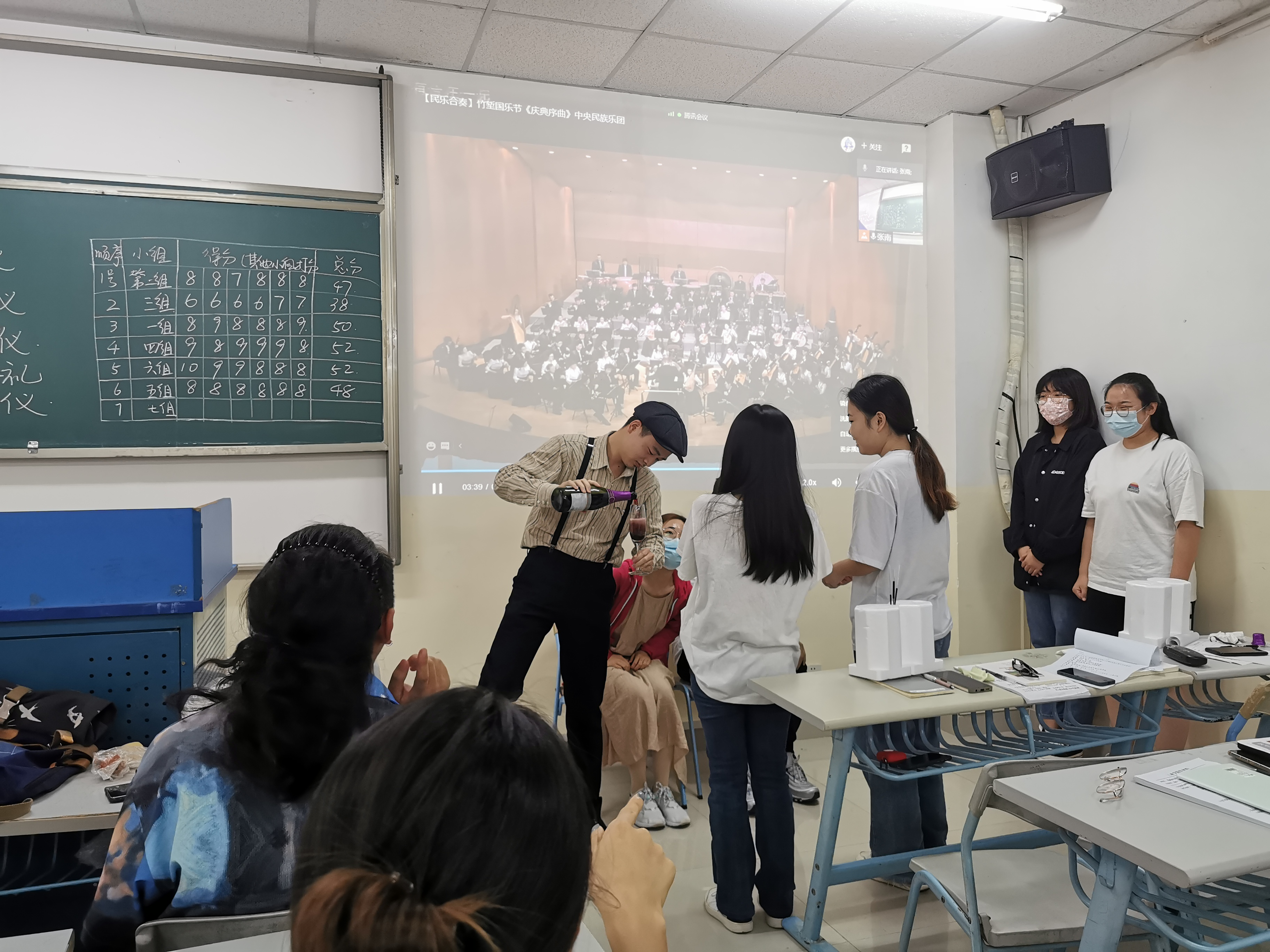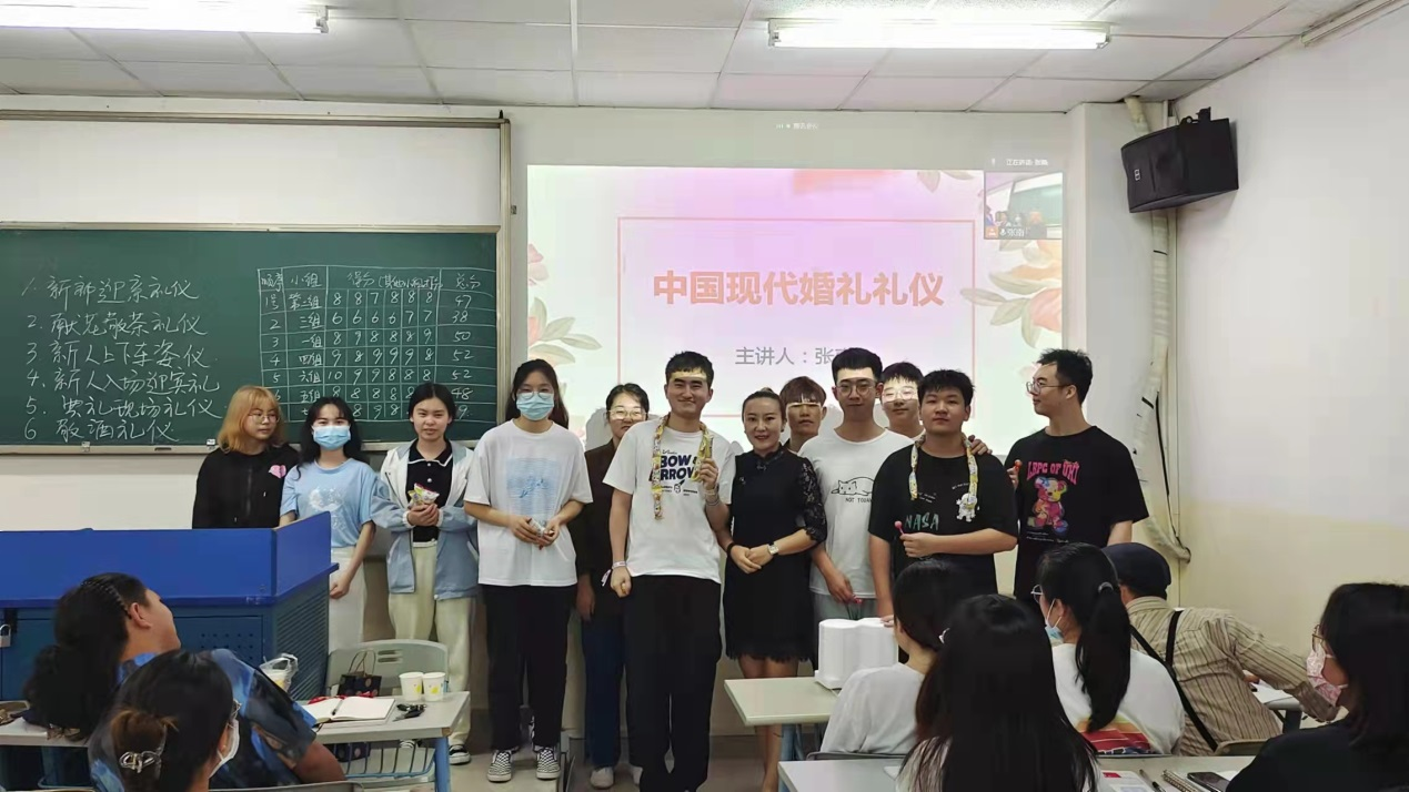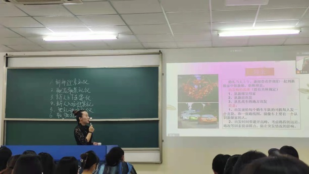 在老师的引导下,学生们在课前分配好角色,各小组根据对中国现代婚礼的风俗礼仪知识的不同理解,进行了各类情景演义。学生们通过对场景的设计以及道具的应用,把礼仪文化与音乐、照片、视频相融合,将所学的中式婚礼礼仪知识要点完整的展现在课堂上。课上小组的PPT展示与表演更是激发了学生的学习兴趣,张南老师对此也称赞不已,为学生们做了现场点评和总结,并给表现优秀的小组成员颁发了奖品。这项专业课不仅培养了学生们的创新能力和自学能力,同时对各知识点也有了较深的印象。