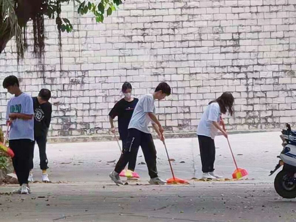 我班学生们认真清扫路面枯叶