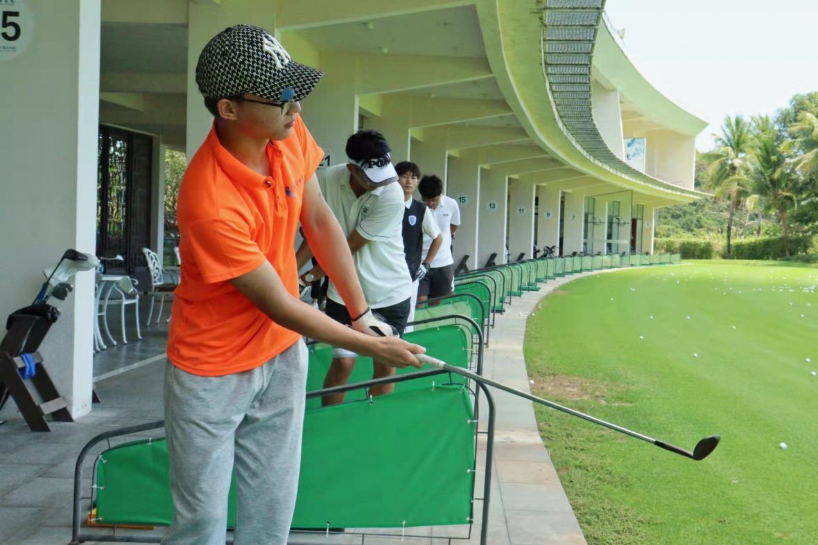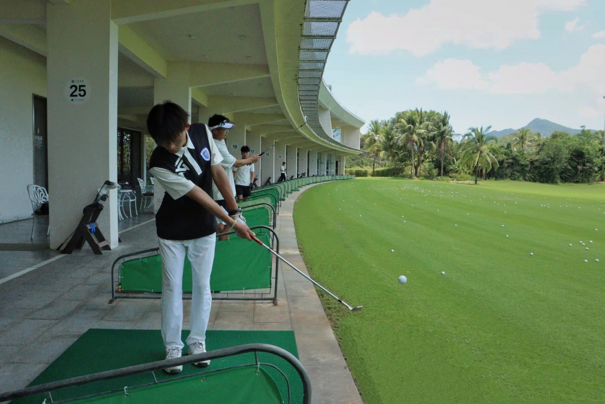 考核正式开始,只见球员双腿分开站立,手握球杆,聚精会神地观察、计算着合适的距离,得到老师示意后利落地挥出球杆,高尔夫球在空中划过一道精彩的抛物线之后落入圈内,一旁同一时间响起热烈的掌声。