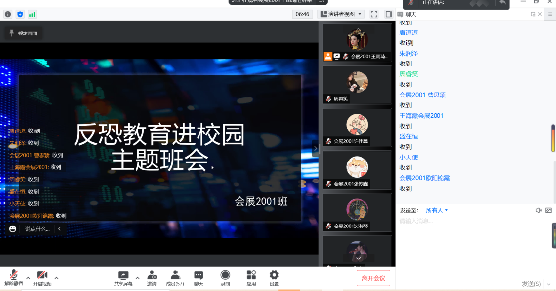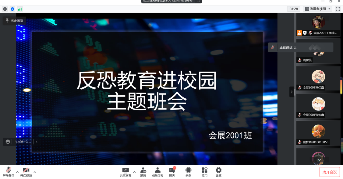 4月11日下午2时,由班级团支书王雨琦组织,召开了“反恐怖宣传教育进校园”主题班会,会展2001班全体学生参加。王雨琦向班级学生们讲解了国家安全相关知识,并播放了相关视频促进学生了解基本的反恐知识。在校园里,学生要增强安全意识,掌握一些基本的技能,在遇到危险时才可以有效地自救。会议中学生们认真听讲,并积极地与主讲人交流。