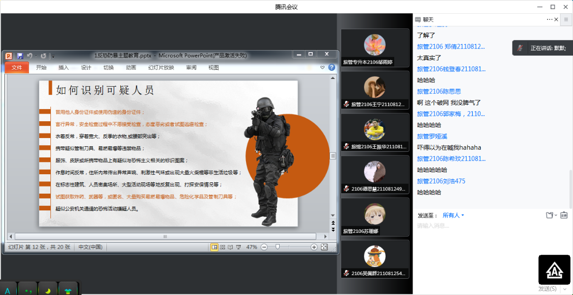 旅游管理专升本2106班班长郭伟在此次线上班会分别从三方面讲解:恐怖主义与恐怖袭击、如何识别恐怖袭击及恐怖袭击的应对。班长郭伟利用视频、资料等为学生们展示了各类恐怖袭击的案例,从思想上引起学生们的重视,牢牢树立安全第一的意识,呼吁学生们要正确规避危险,保护自己,珍惜生命。