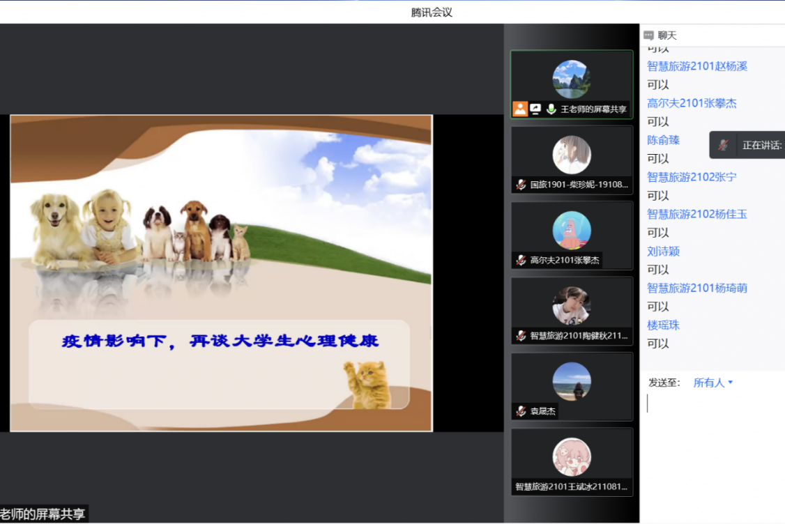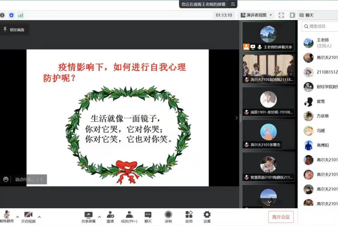 响应疫情防控需要,9159金沙游戏场实行严格封的闭管理制度,为了解学生们疫情防控下的心理健康状况,我院学业指导老师王水卿于4月12日下午四点在腾讯会议开展了“疫情影响下,再谈大学生心理健康”讲座,9159金沙游戏场学生积极参与线上会议。