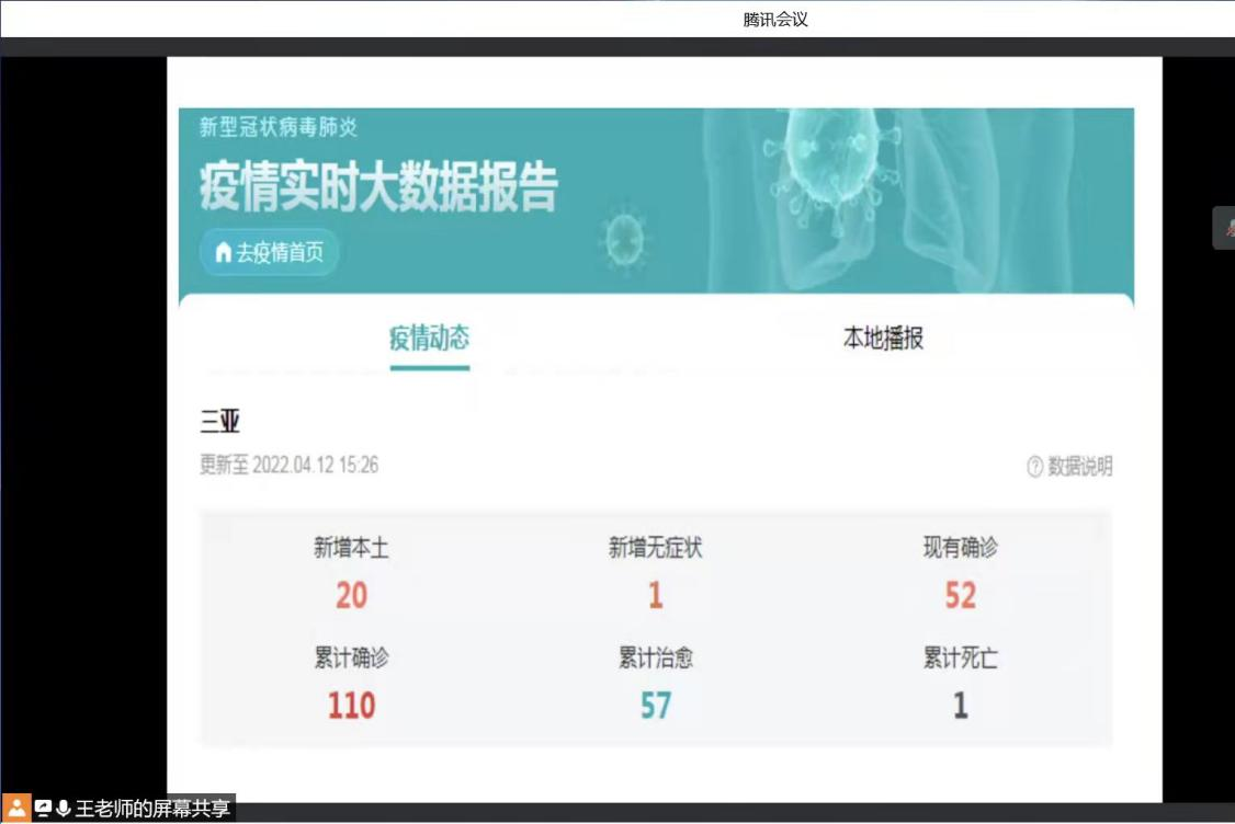 会议伊始,王水卿老师介绍了目前的疫情情况,如今三亚疫情形势险峻,为更好的控制新冠疫情的传播,现学校严格控制人员进出,封校管理给学生们的学习生活带来了一定的不便,更产生了心理上的压力。强压之下,学校也在可控范围之内积极丰富学生的校园生活,老师提醒学生们要保持健康向上的心态,相信疫情终会过去。