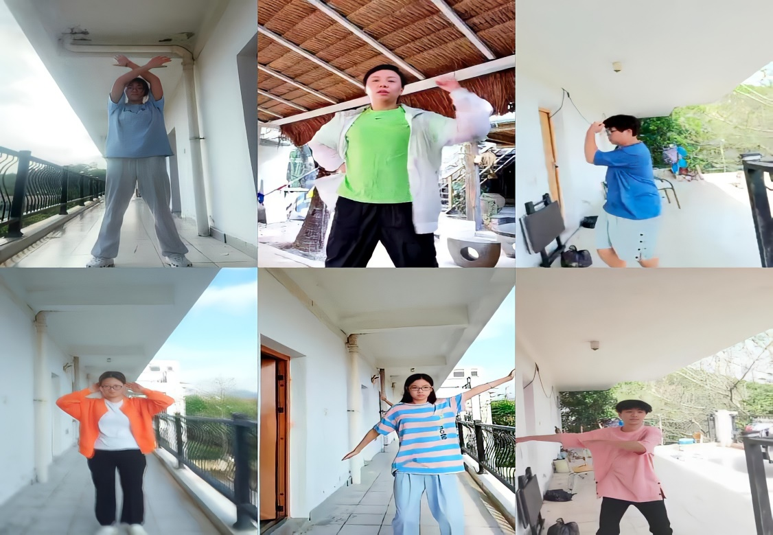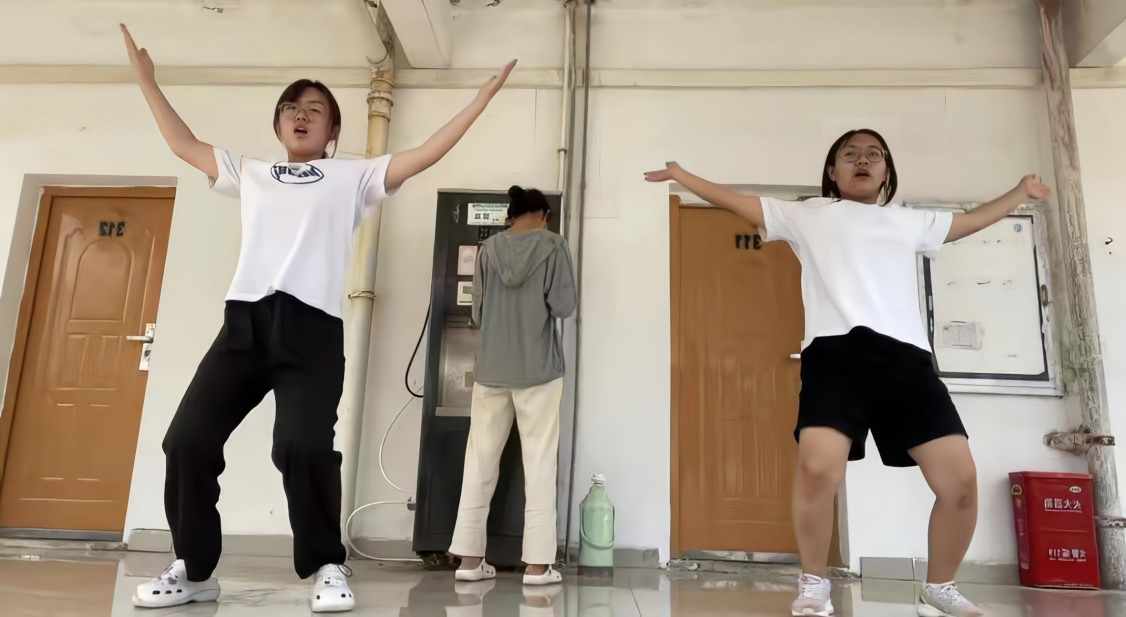 张郅睆老师作为商务礼仪的授课老师,她带领学生们通过腾讯会议平台学习手位操动作,而练习结束后,每位学生也需录制视频用于老师课后考察。线上的手位操教学,使得宿舍楼的各处都有学生练习手位操的身影。欢快的手位操音乐更是立体环绕在宿舍楼里,也为线上课程增添了几分趣味。