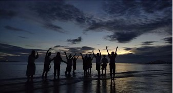 抵达时天空也在此刻恰巧放晴,好似在等着我班学生的到来。海风吹拂着他们的脸颊,悬挂在脸上的汗珠是他们此次步行劳动的果实。随着太阳的西垂,同学们在海边留下了劳动的纪念。