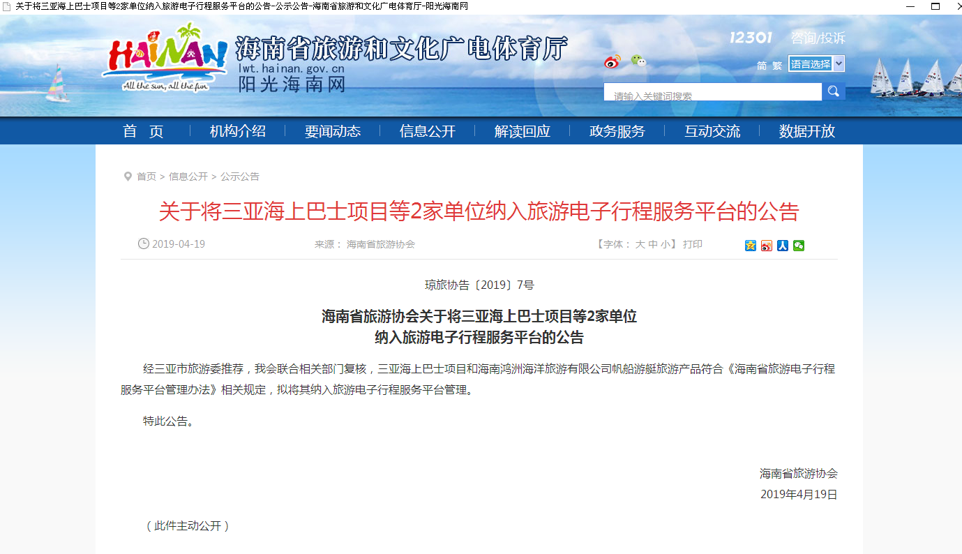2019年4月19日,海南鸿洲海洋旅游有限公司被海南省旅游协会首批纳入旅游电子行程服务平台!