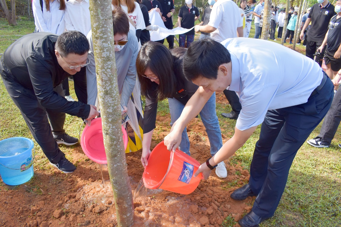 刘开南校长、高一兰副校长与柴勇院长、吴吟秋副书记一同为我院2022届学生毕业树浇水灌溉