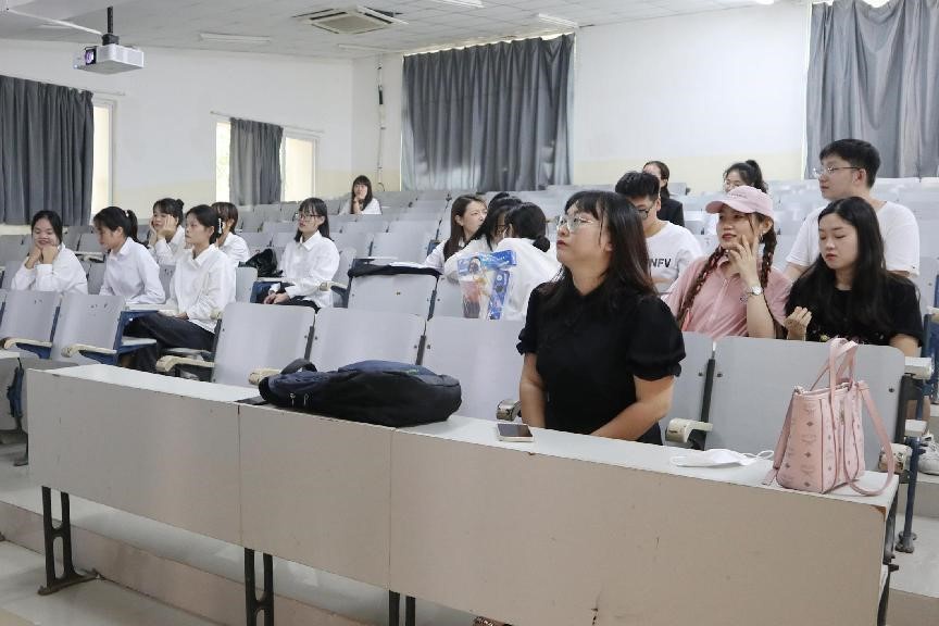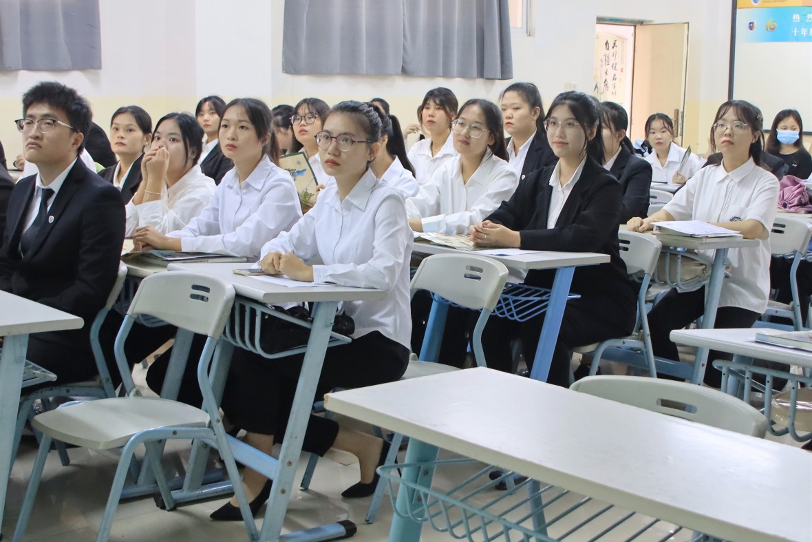 “请问大家对呀诺达景区的第一印象是什么?”高经理首先提出问题,学生们各抒己见,有同学认为景区的服务十分热情,有同学表示景区内项目体验感不错。视频播放结束后,高经理总结到海南呀诺达圆融旅业股份有限公司是集休闲、观光、体验、教育为一体的、可持续发展的生态文化主题景区,并向学生们介绍了此次招聘的重点岗位是导游讲解员,同时展示了实习期间的待遇及福利。随后高经理就学生提出的问题进行回答,为学生们提供了更多招聘方面的信息。