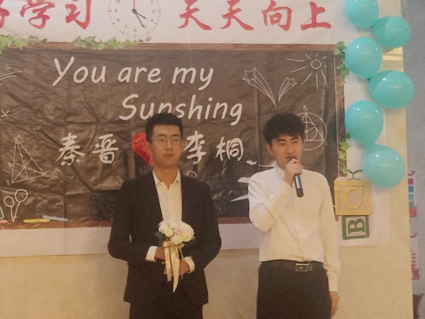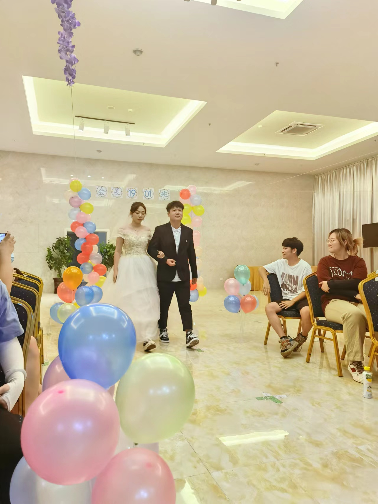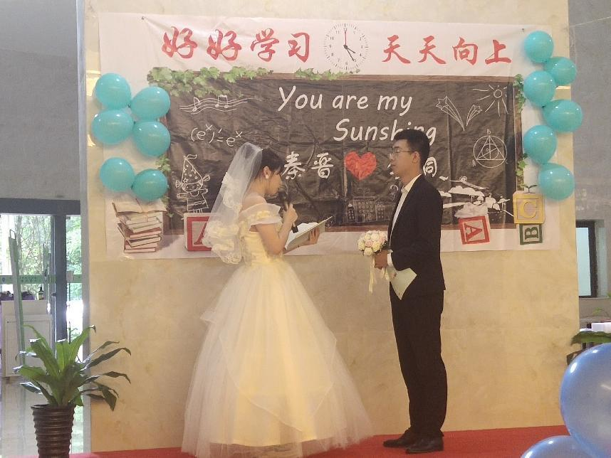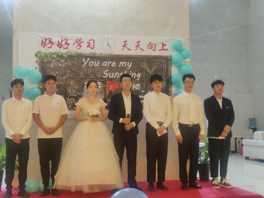 此次活动的设计理念围绕校园爱情故事展开,从校服到婚纱,从校园到礼堂,这里见证了他们的成长与爱情。第四组学生李桐、秦晋、孙大宇、刘磷森、罗健、孙佳龙、任建涛等在白鹭苑实训大厅展开婚礼场景布置。布景主题选用复古风,背景板以学校元素为主,气球彰显喜庆,见证他们从青春一路走来的模样。