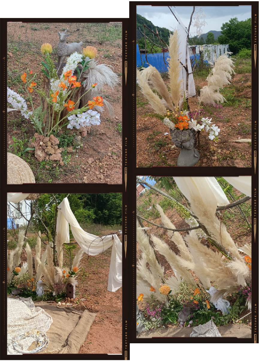 来自会展1901班的第三组学生(崔劲岱、陈康敏、黄一帆、高婧、刘欣宇、刘瑶、柳萌、王惠莹)花费了两天时间,将原本荒废的南区荒台清理干净,以来自校园各地的枯枝朽木与花、藤条结合,打造了独一无二的荒野婚礼。荒野风格选择明黄和橘黄两种颜色作为主题色,更加的贴近自然,与草坪婚礼相比独具特色,更加体现新一代年轻人敢于抗争,追求个性的风格。