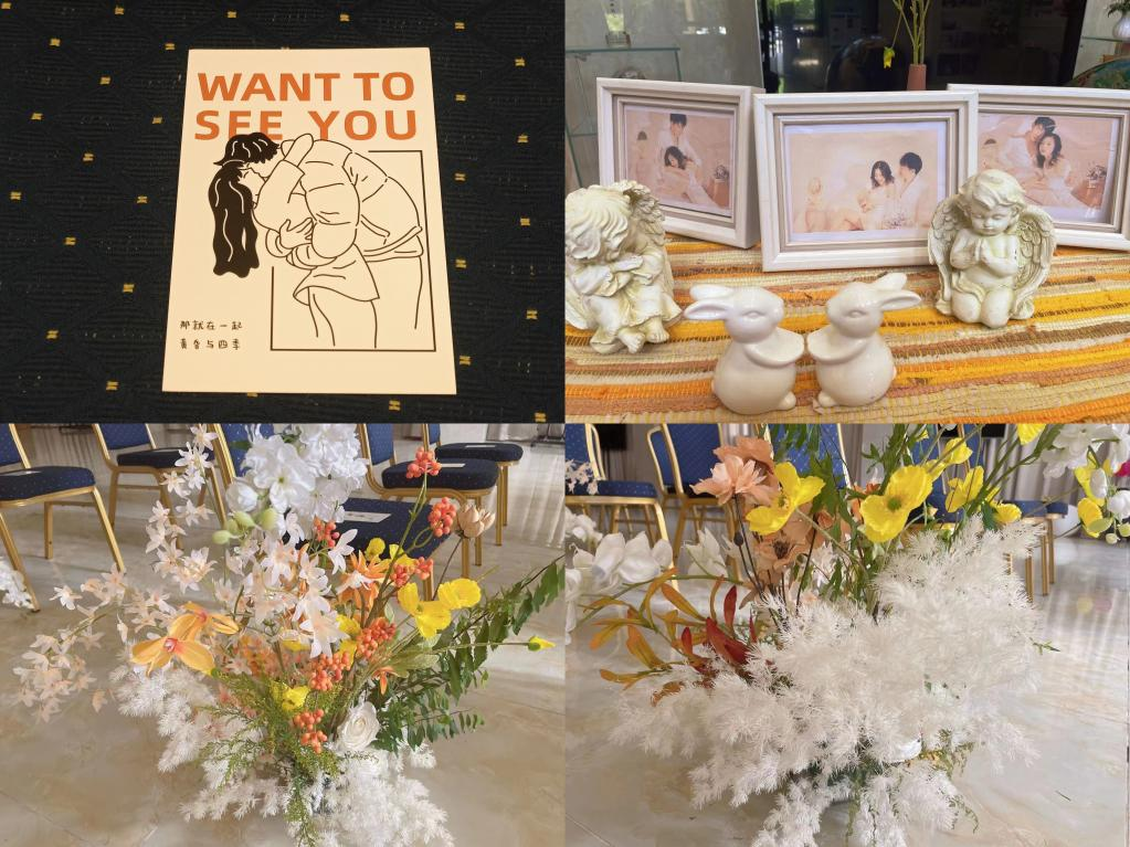 整体色系以橙黄色为主,是代表了热烈与明亮。背景墙设计为纯手工制作的纸艺花;通道两边的路影采用的是真花与仿真花共同结合的插花设计。花艺做为本场婚宴的主要点缀部分,使现场布置的整体氛围感活跃、高级;迎宾签到区放置新人的婚纱照以及一些复古且有设计感的摆件作为装饰,签到板是画布材质,上面的橙黄色油画背景以及LOGO为纯手工画就,彰显艺术感。