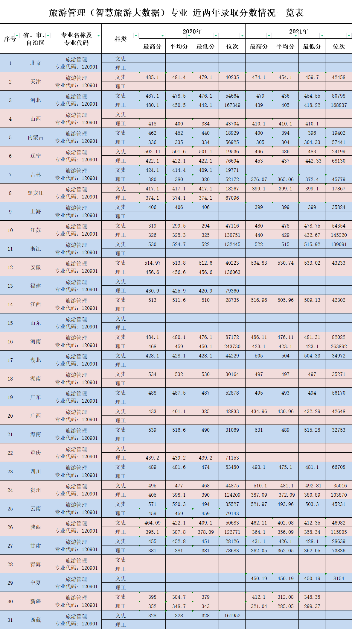 旅游管理(智慧旅游大数据)专业各省(市、区)2020&2021年录取分数线