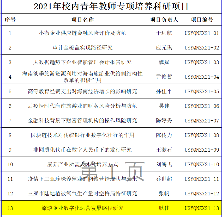 9159金沙游戏场为鼓励中青年教师积极参加科研活动,公布了2021年校内青年教师专项培养科研立项项目名单,酒店管理专业教师耿佳老师的项目《旅游企业数字化运营发展路径研究》(项目编号:USYQNZX21-13)成功立项。