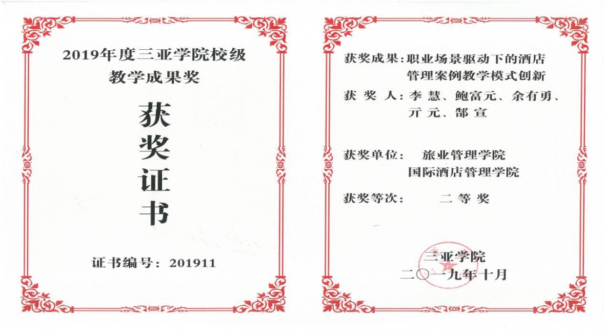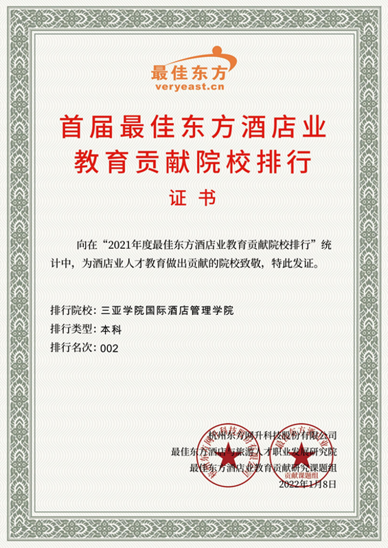 酒店管理专业作为省级应用型试点专业和校级重点专业,发起成立海南省酒店业创新人才培养联盟,承担国家级课题2项、省部级课题30余项、横向课题40多项,荣获科研奖项15项、省级教学成果奖2项、校级教学成果奖1项、校级教学改革创新奖3项,且业界高度认可,2018年被希尔顿集团大中华区授予“人才培养卓越贡献奖”和“最佳合作院校”,2019-2021年连续三年被最佳东方评为“优秀人才培养院校”,2021年为最佳东方评选的最具影响力的酒店业教育贡献院校,并名列本科组院校第二名。学院酒店专业在《2021中国大学评价研究报告》中被评为排名第一的六星专业,并成为MTA专硕点建设方向,力争将学院打造成为亚洲最具竞争力的酒店管理教育学院。