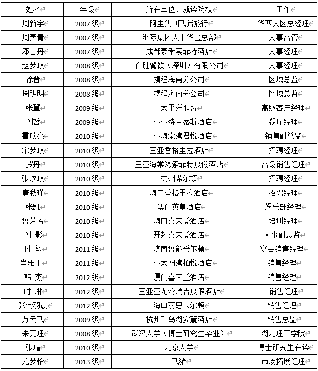 学生就业去向。专业与全球近100家的酒店、航空公司、奢侈品、地产公司及旅游企业合作,如中免集团、亚特兰蒂斯、洲际、万豪、希尔顿、美高梅、携程、迪士尼等,每年举办两场海南省最大型的“泛酒店管理”人才招聘会,参会企业来自海南、珠三角、长三角、京津冀等多个区域。历年就业率均在98%以上,且有优秀毕业生在北京大学、武汉大学、瑞士蒙特勒酒店管理大学等国内外名校深造并获得硕士、博士学位。