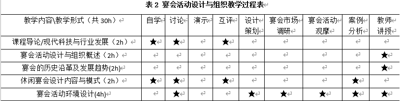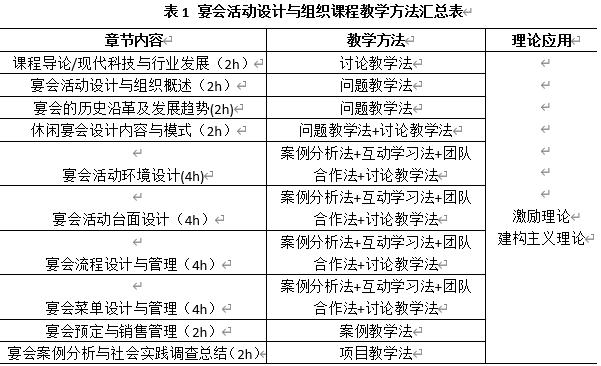 宴会活动设计与组织该门课程综合运用了讨论教学法、问题教学法、团队合作法、案例分析法、互动学习法、项目教学法等教学方法。本门课程针对不同章节的教学内容特点,将选择不一样的教学方法,以达到让学生理解该章节内容,掌握该章节教学目标要求的目的,每章具体内容与相应教学方法的采用详见表1。