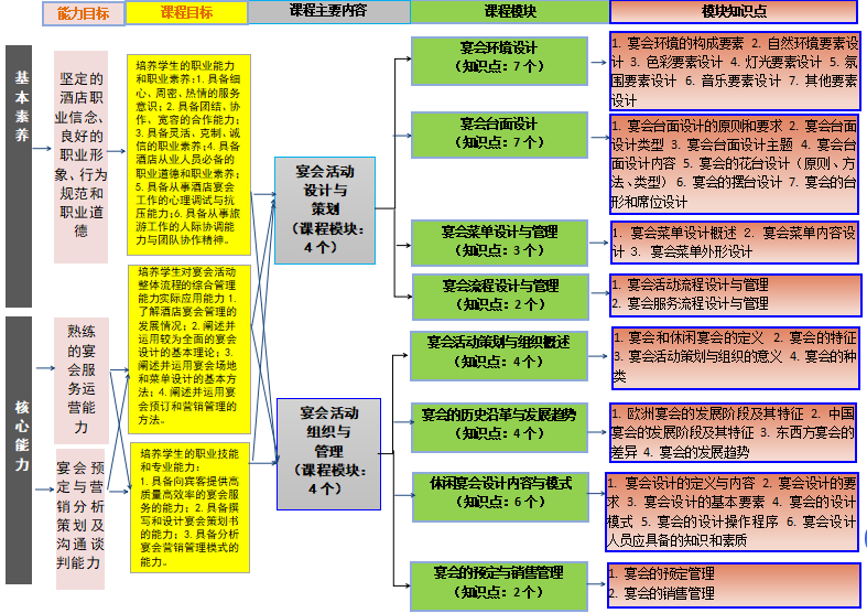 《宴会活动策划与组织》是酒店管理专业的一门专业核心课程。课程教学将能力培养作为核心,贯彻理论联系实际、学以致用和因材施教的原则。课程重点关注学生宴会设计能力,组织与管理能力,运用多种手段对学生的设计和管理能力等方面的培养。通过加强教学的实践性环节,突出应用性,有利于培养学生成为专业的宴会设计与管理人才。