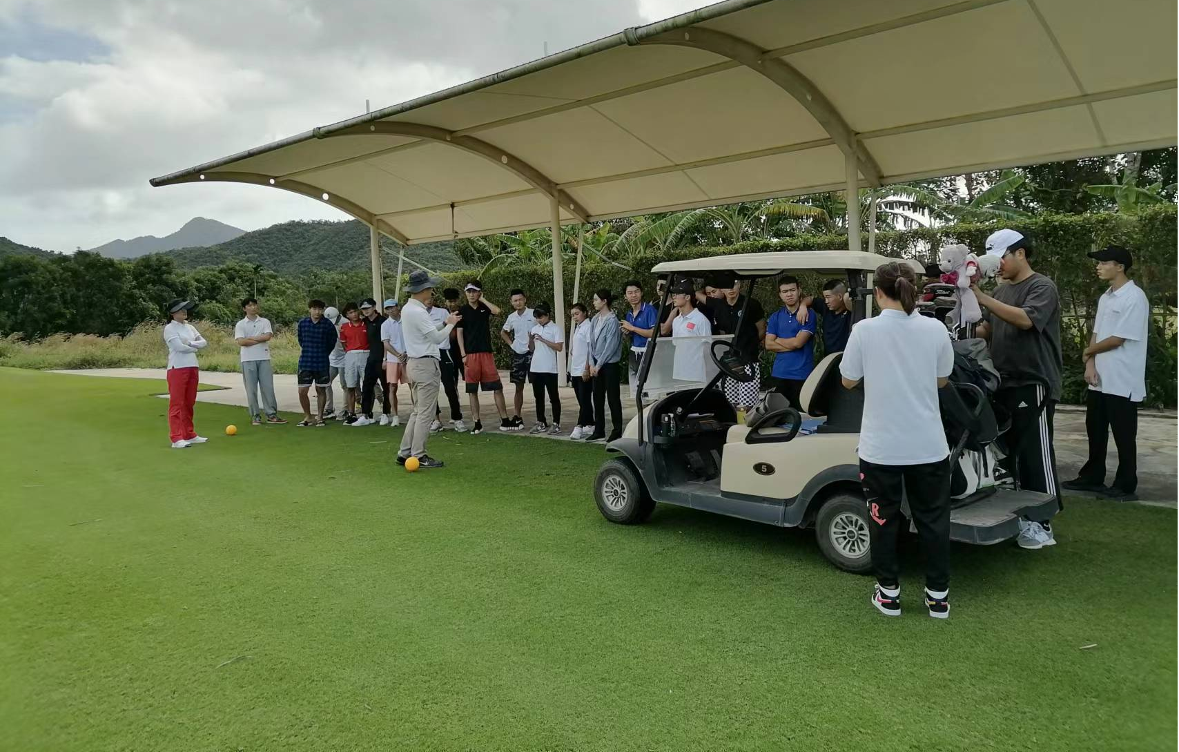 教师在高尔夫球场对学生进行场地服务环节认识教学