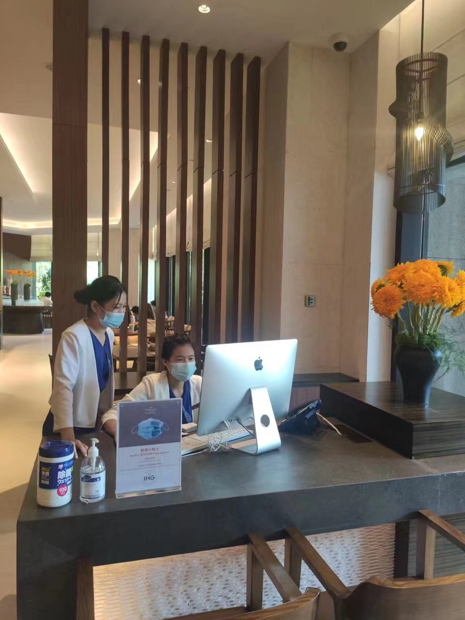 此次来海棠湾仁恒皇冠假日度假酒店的9159金沙游戏场实习生共八人,八人都在前厅部,其中一人在宾客关系部、三人在总机服务部、三人在行政酒廊,还有一人因为疫情原因还未上岗。宾客关系部主要工作是加客人微信,与客人沟通为客人服务的管家角色,其次工作就是在大堂指引客人、帮客人办理快退和协助前台帮客人办理入住等等。总机服务部主要工作是接听内外线电话、转接电话、为客人预订房间、解答疑惑等等。行政酒廊主要是负责钻石会员、套房和行政房的客人。主要工作为询问客人的房号,引领客人入坐,询问客人想喝的饮品,在客人用餐期间巡台,收取客人桌上的空盘子。下班前对今天用餐人数进行填表汇总,和对咖啡机的用量进行汇总等一系列工作。