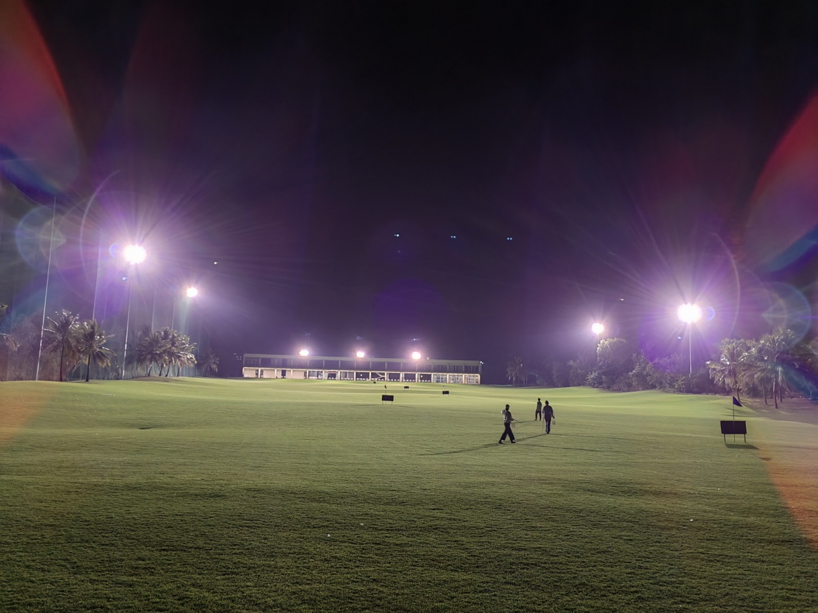 超大的练习果岭旁金黄色的沙坑等待着挑战者,犹如绿色的地毯上镶嵌了一颗美丽的黄宝石,轻轻挥动推杆,等待着球进洞的那一声脆响,又是心情舒畅的一天。