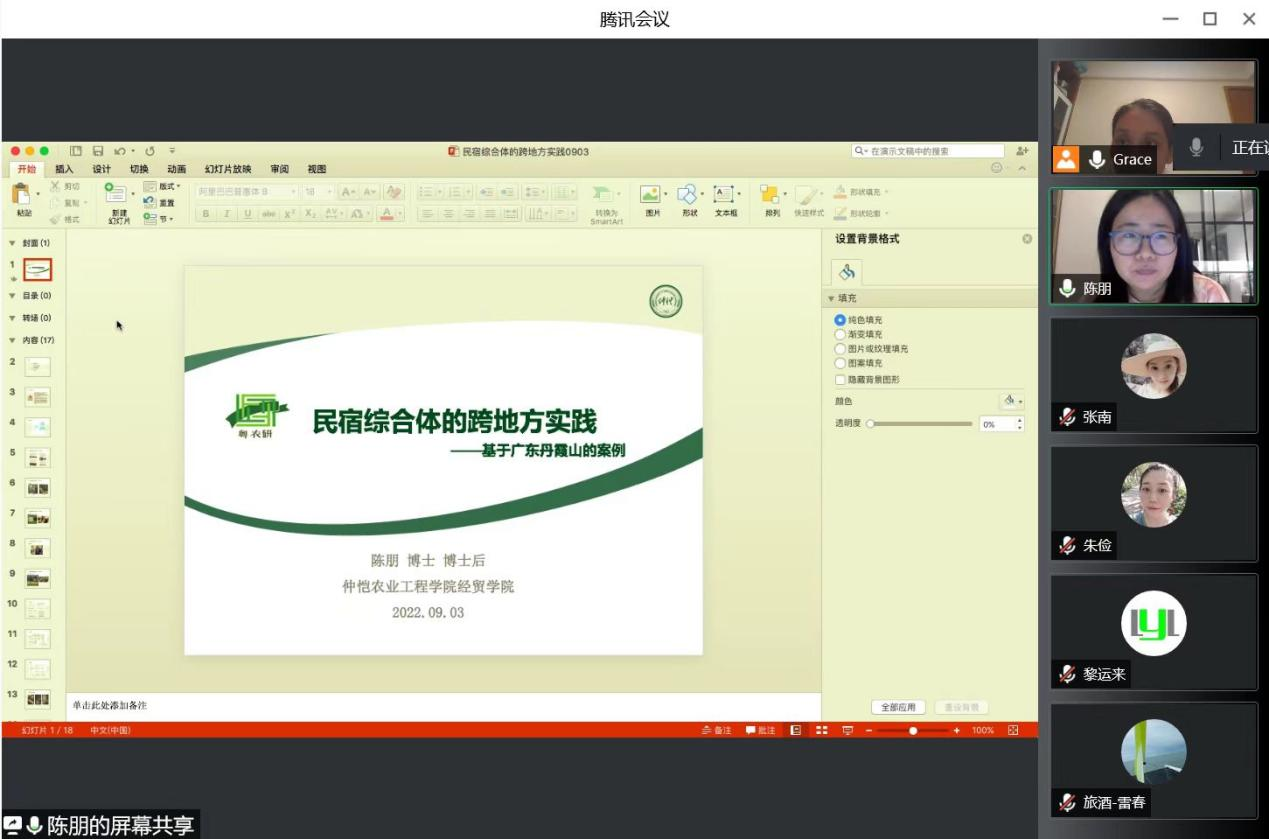 随后,仲恺农业工程学院的陈老师结合暑期调研,分享了旅游民宿综合体的跨地方实践——基于广东丹霞山的案例。通过长期追踪,对广东丹霞山的特色民宿主理人进行访谈,了解当地旅游民宿的发展状况。陈老师分享了四个案例:山原色、碧水花寨、丹霞印象和爱树——丹霞山苑。四家民宿在发展过程中都实现了市场的跨地方、资源的跨地方和人员的跨地方。并探讨了民宿的可持续经营问题和民宿与农村区域的融合发展问题。