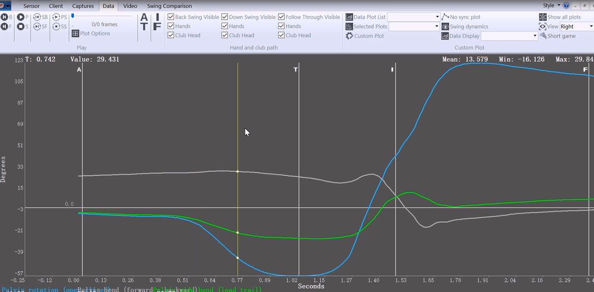 我们可以看到上列三张图片左侧的数据都不尽相同,这也代表了运动员在做某一个动作节点时他的胸椎、骨盆、手部等身体部位的移动及发力情况,如