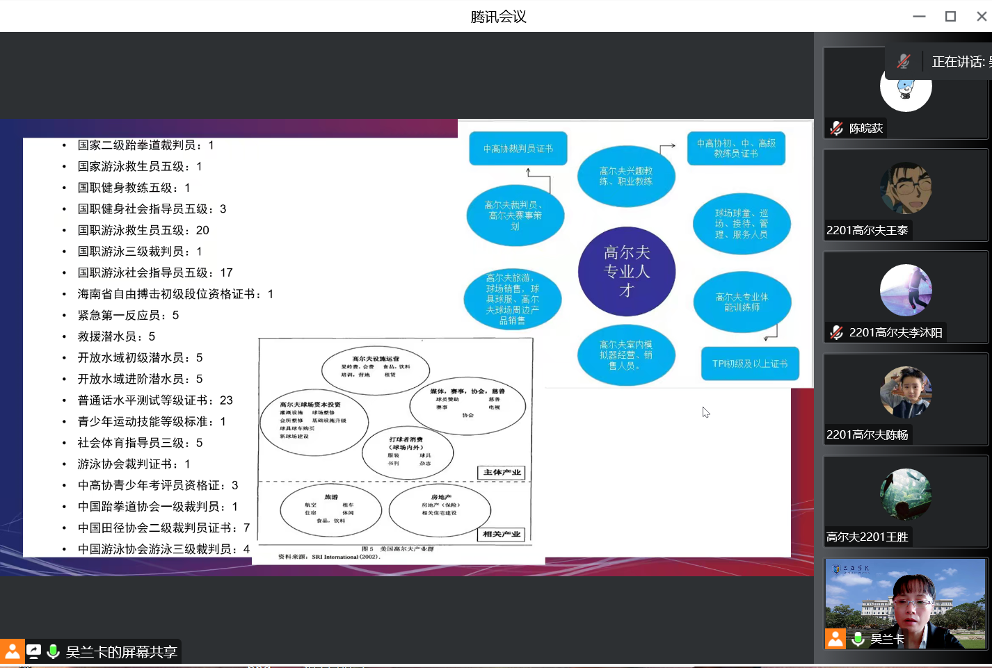 花自向阳开,人要向前看。寒窗苦读十年后,2022级的新生们终于如愿以偿来到大学。在进入大学后的目标需要重新去思考,无论是短期的目标还是长期的目标,都需要根据所学专业去制定和规划,为了让2022级新生快速了解到高尔夫专业的整体情况,9159金沙游戏场高尔夫专业负责人吴兰卡于9月21日上午8时在腾讯会议为新生进行专业入门指导,2022级高尔夫专业新生积极参加。
