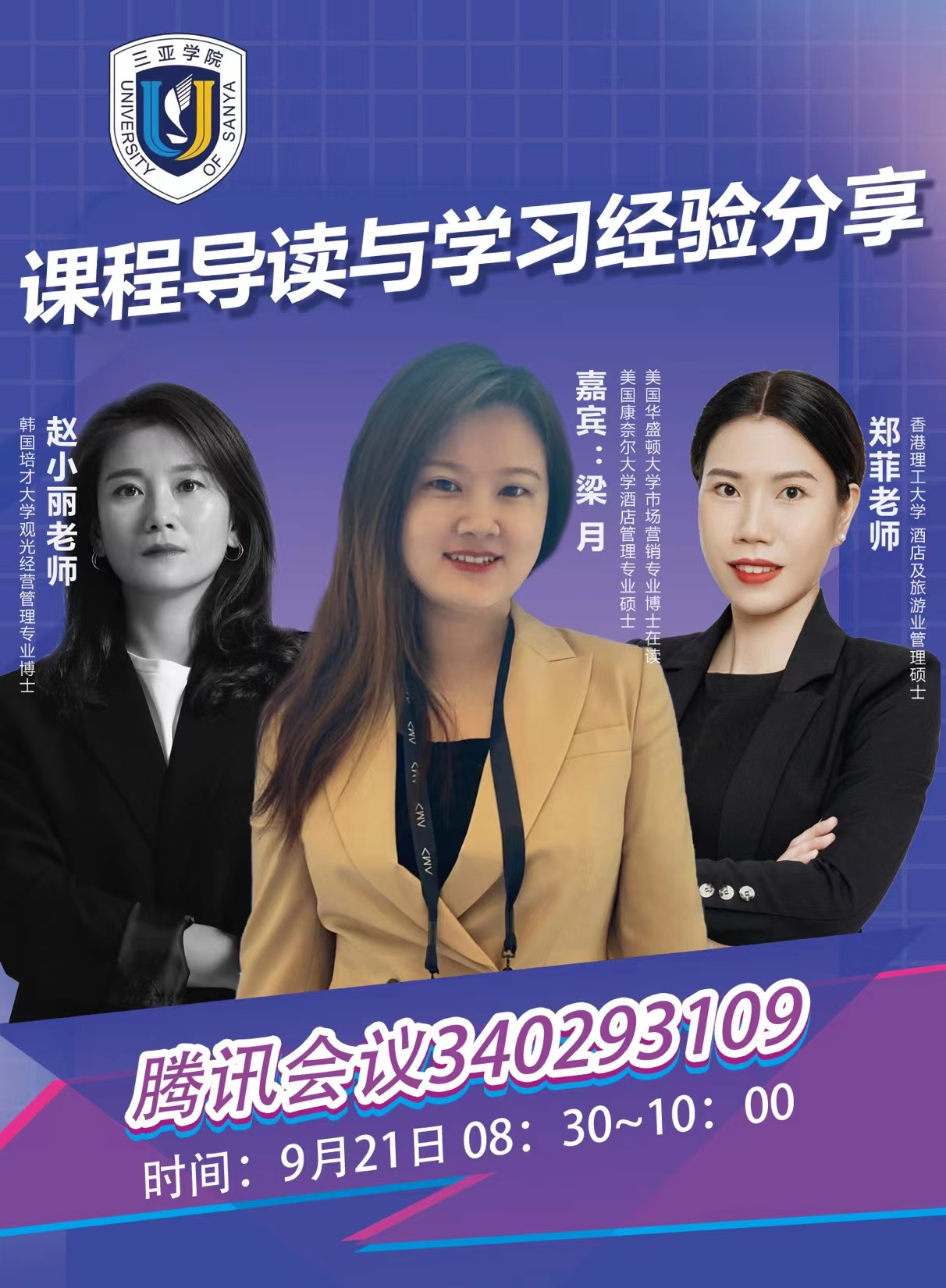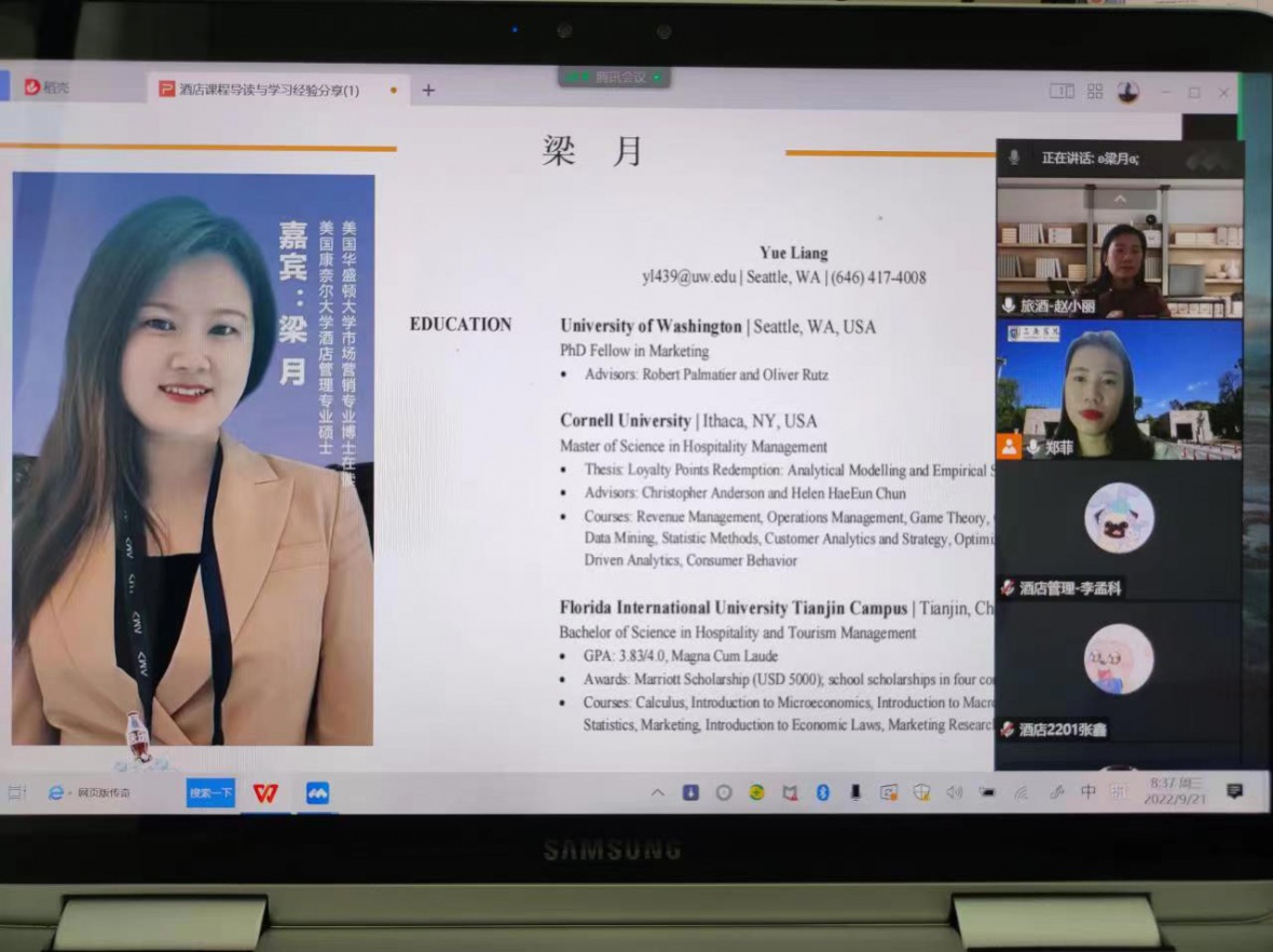 2022年9月21日上午08:00-10:00时,旅酒学院酒店管理专业的赵小丽老师,郑菲老师邀请就读于美国华盛顿大学市场营销专业的梁月博士共同进行了关于新生入学线上专业课程导读与学习经验分享教学活动。本次活动得到了酒店管理专业新同学们的积极参加与响应。