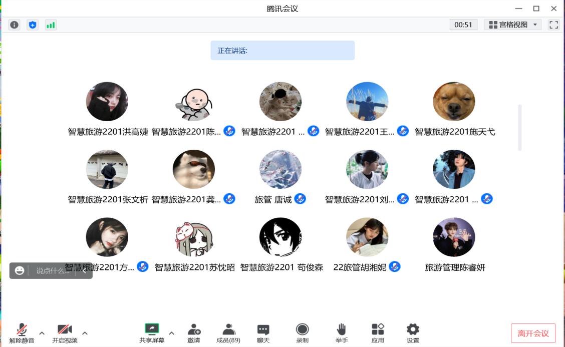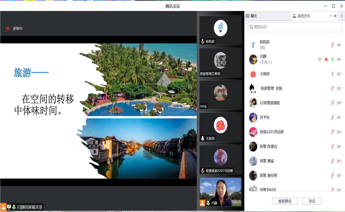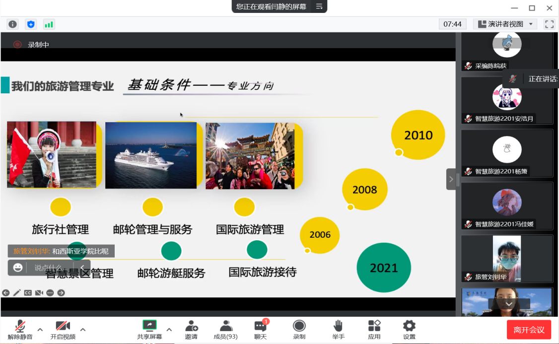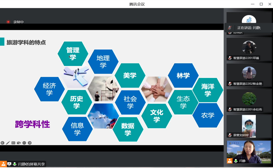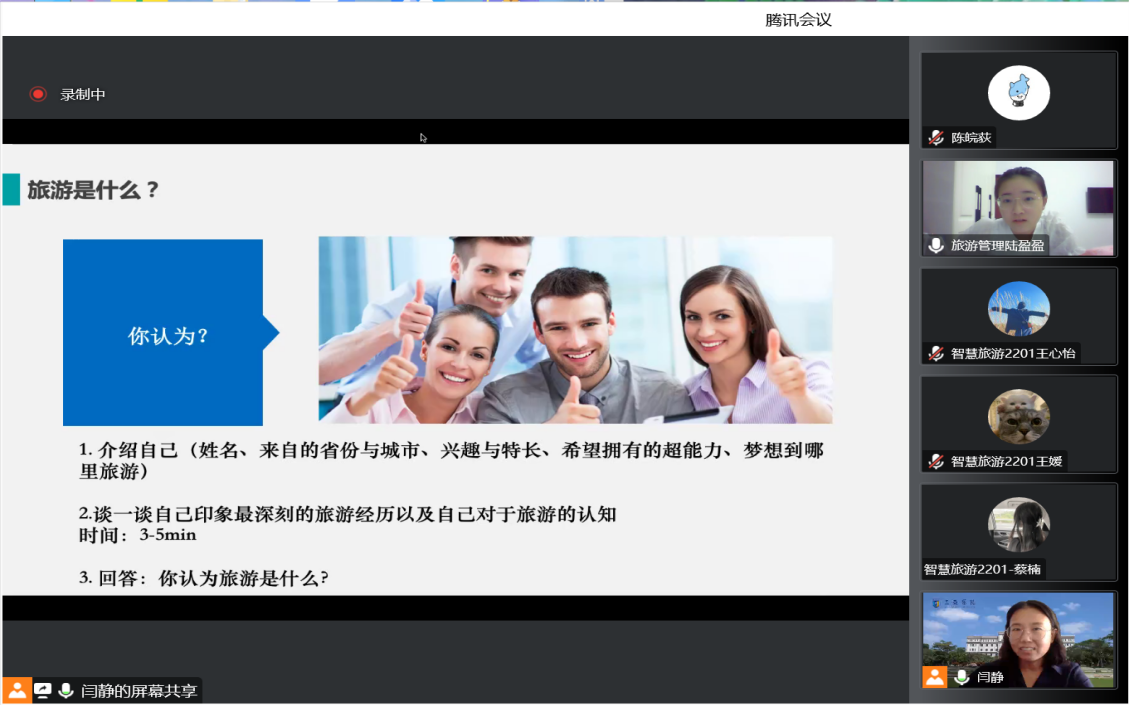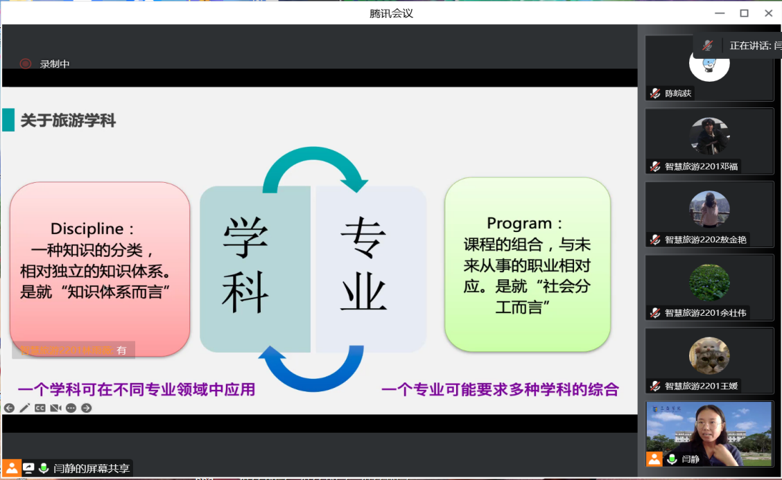 首先,闫静老师提出了一个“旅游是什么?”的问题与学生们互动。即使是线上教学,2022级新生们也积极与老师互动。互动的同学向老师介绍了自己的家乡和梦想,并讲述了自己对于旅游的认知及印象深刻的旅游经历。互动之后,闫静老师简单分析了学科和专业的不同点,并表示学科可在不同专业领域中应用,专业可能要求多种学科的综合。