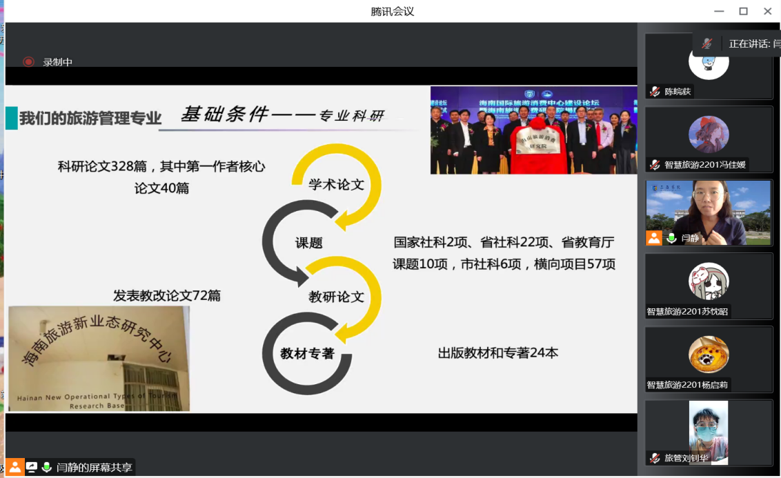为了让2022级新生们对旅游管理专业有初步的认识,了解旅游管理专业的基本学习内容、学习的方向和方法及学习中可利用的有效资源,使学生们能在学习旅游管理专业的过程中有明确的学习方法和态度,并在进入正式的专业课程前熟悉关于旅游管理的专业内容,我院旅游管理专业主任闫静于9月21日上午9时在腾讯会议为2022级新生介绍专业知识。