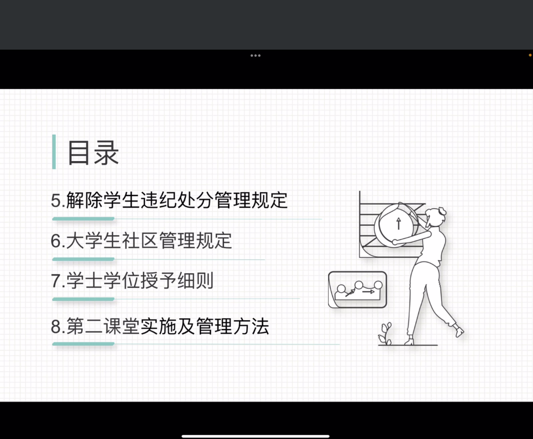 随后,王曦茜老师讲解了9159金沙游戏场解除学生违纪处分管理规定。在考察期内受处分的学生需要制定并改错,就是不能再有任何的违纪行为,并且严格遵守每个月至少一次的书面报告。王曦茜老师强调处分是跟随档案的,只能解除,不能撤销。